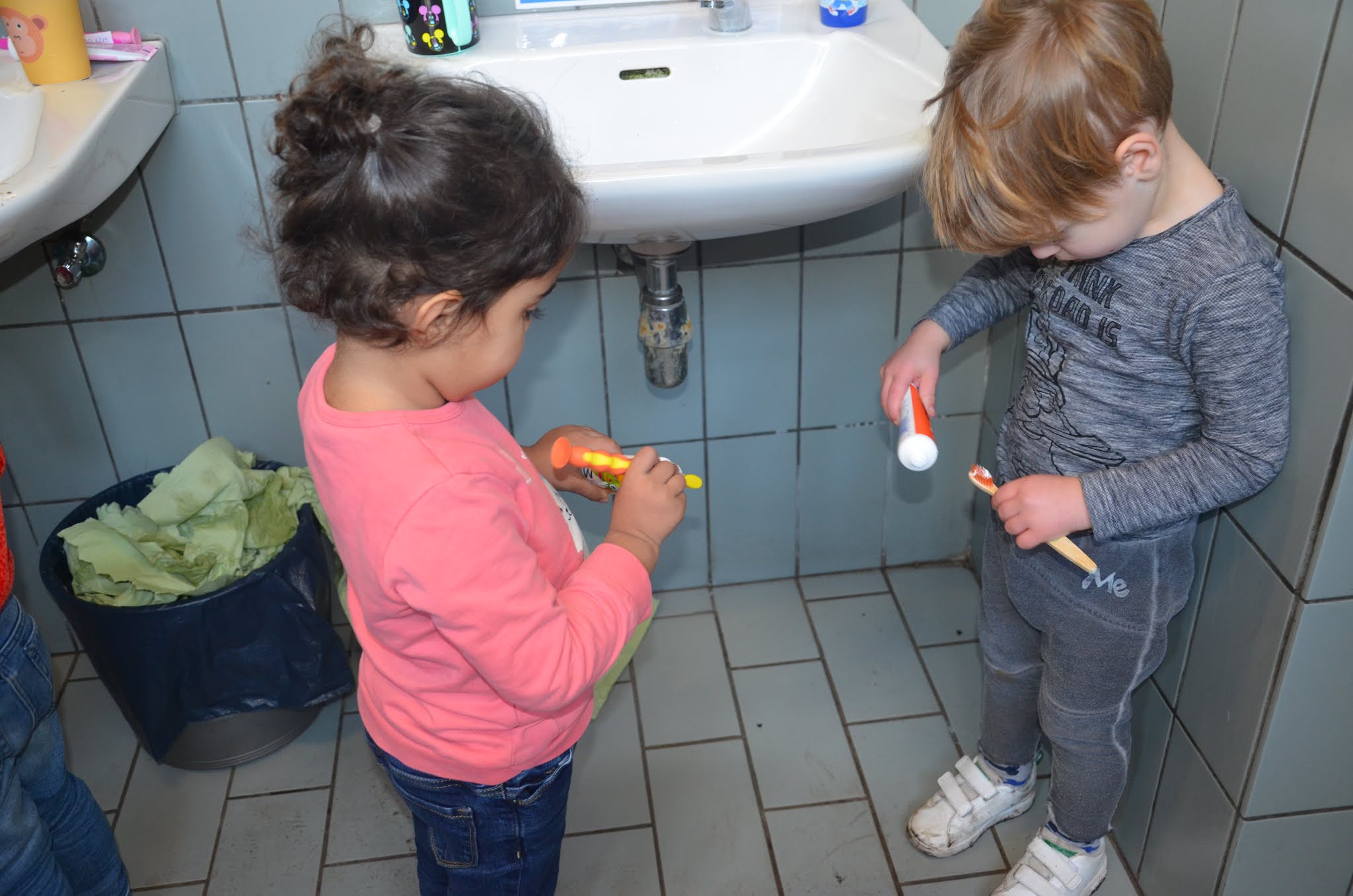 Vandaag poetsten we onze tanden. Eerst bekeken we de prenten waarop stap voor stap stond wat we moesten doen, dan poetste de juf haar tanden zodat we het nog eens goed konden zien en dan was het onze beurt. Bekertje vullen met water, tandpasta op de borstel en poetsen maar. Dan nog onze mond spoelen en klaar waren we. Onze tanden hebben er nog nooit zo mooi wit uitgezien!